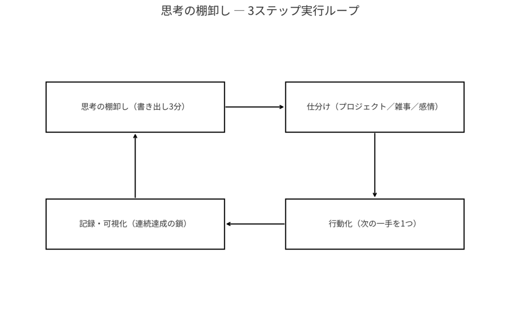 • 図1:思考の棚卸し ― 3ステップ実行ループ(ボックス図)