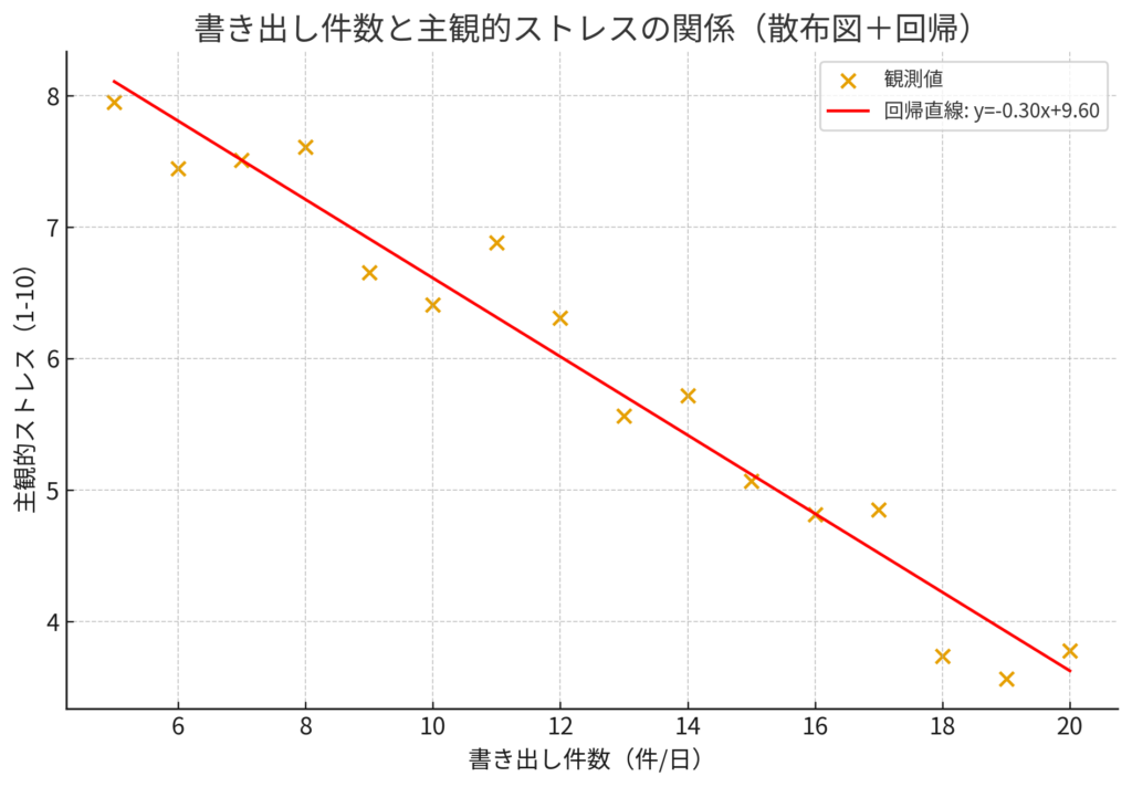 • 図2:書き出し件数と主観的ストレスの関係(散布図+回帰)