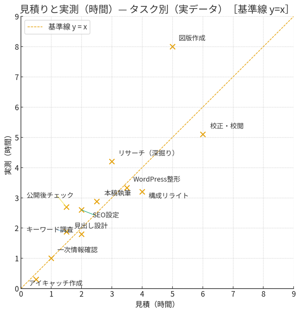 図1で誤差の大きいタスクを特定し、図2で系統的な過小/過大の偏りを確認。偏りが出る条件(時間帯・メンバー・前提不備)を短評に残し、補正率とテンプレ時間を更新してください。