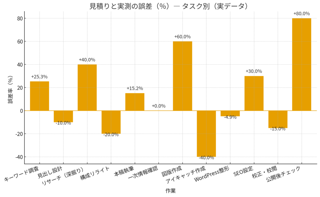 図版作成(+60%)**のような長尺作業は、レビュー往復・資料探索・図版修正といった“見積り外”の混入で膨らみやすい → 分解+承認待ちの独立が有効。