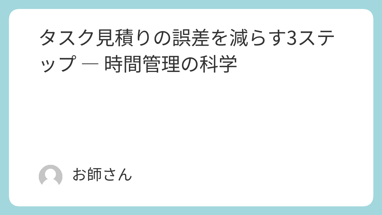 「2時間で終わるはずが、半日かかった」。――この“見積りズレ”は、締切遅延・品質低下・自己評価の毀損にまで影響します。本稿では、なぜ見積りがズレるのかを科学的に整理し、今日から回せる分解→記録→補正の3ステップを提示します。最後に独自の見積りvs実測データと**図版(PNG/SVG)**を掲載しました。