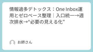 情報の入口をOne Inboxへ統一し、朝昼夕の3回だけ処理。週次の“排水”で未読の水位を下げ、必要情報だけを見える化。ゼロベース整理の7ステップと運用表を公開。