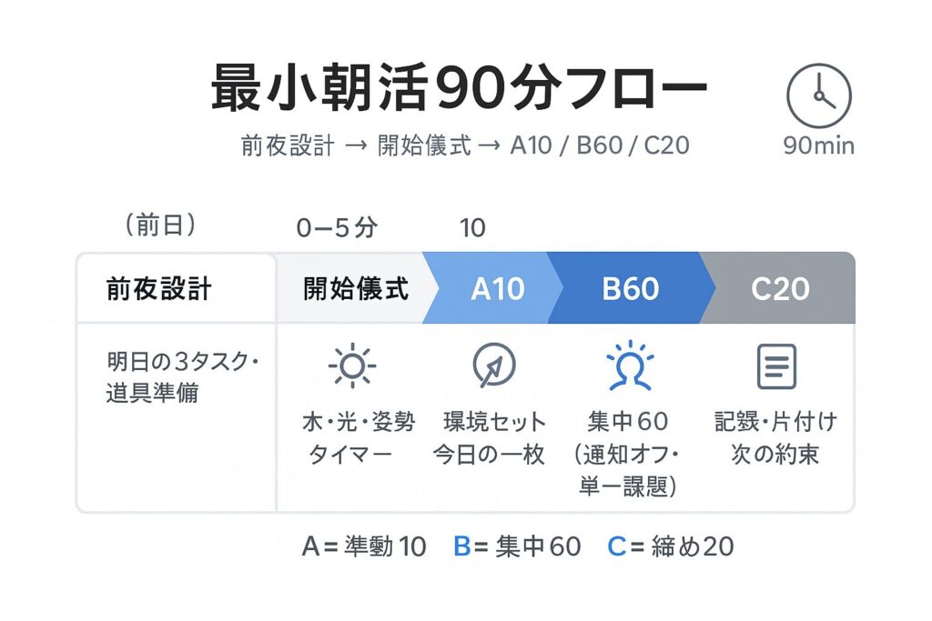 朝は“準備の上手さ”で9割決まります。前夜に道を敷き、3分の開始儀式で迷いを断ち、A起動・B最重要・Cレビューの3ブロックで90分を機械的に回す。——この最小構成なら、忙しい日でも“やるべき一つ”を確実に進められます。