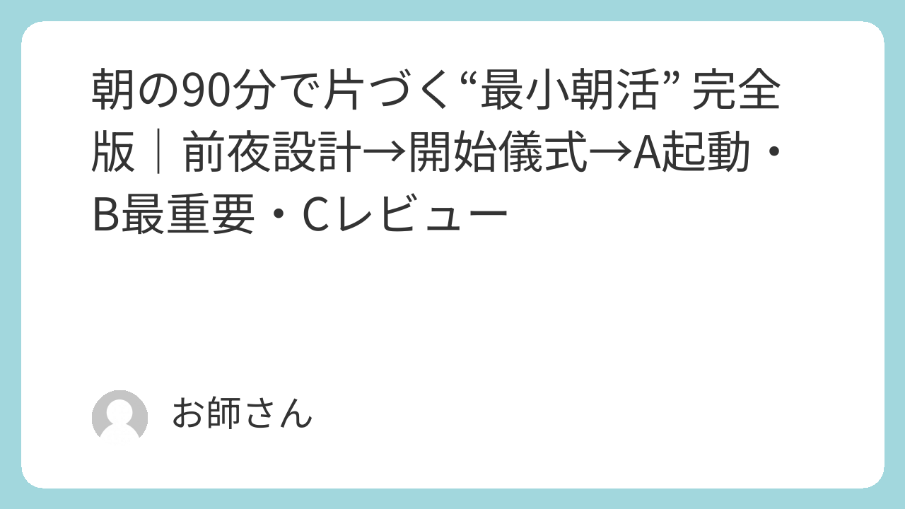 朝は“準備の上手さ”で9割決まります。前夜に道を敷き、3分の開始儀式で迷いを断ち、A起動・B最重要・Cレビューの3ブロックで90分を機械的に回す。——この最小構成なら、忙しい日でも“やるべき一つ”を確実に進められます。