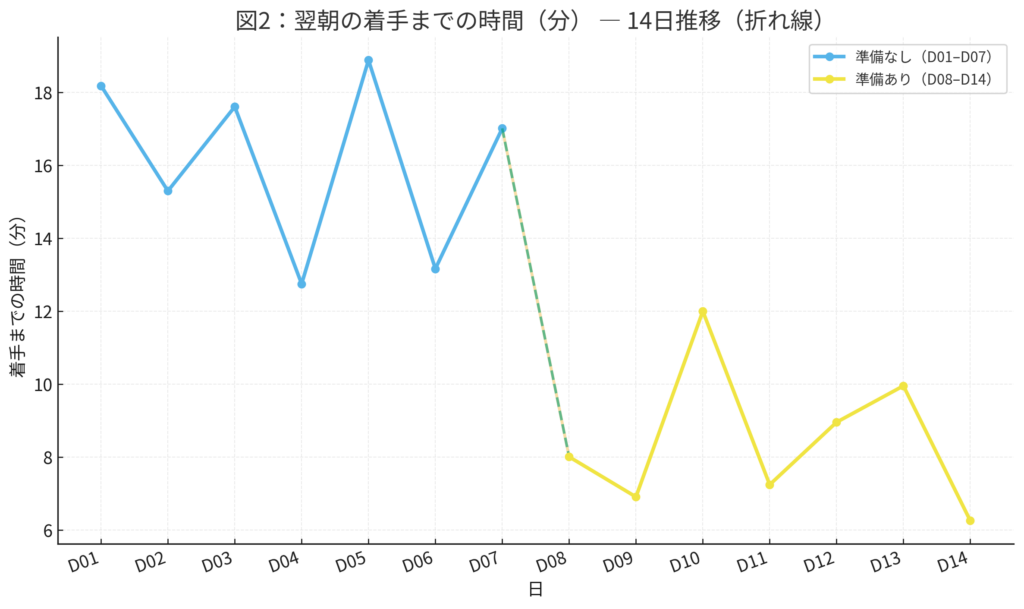 14日間のサンプルでは、前夜準備なし(1〜7日目)の平均着手までの時間は約17分/完了率58%、前夜準備あり(8〜14日目)は約8.2分/完了率82%という差が見られました。準備が着手の摩擦を下げ、完了の見通しを立てていることが分かります。