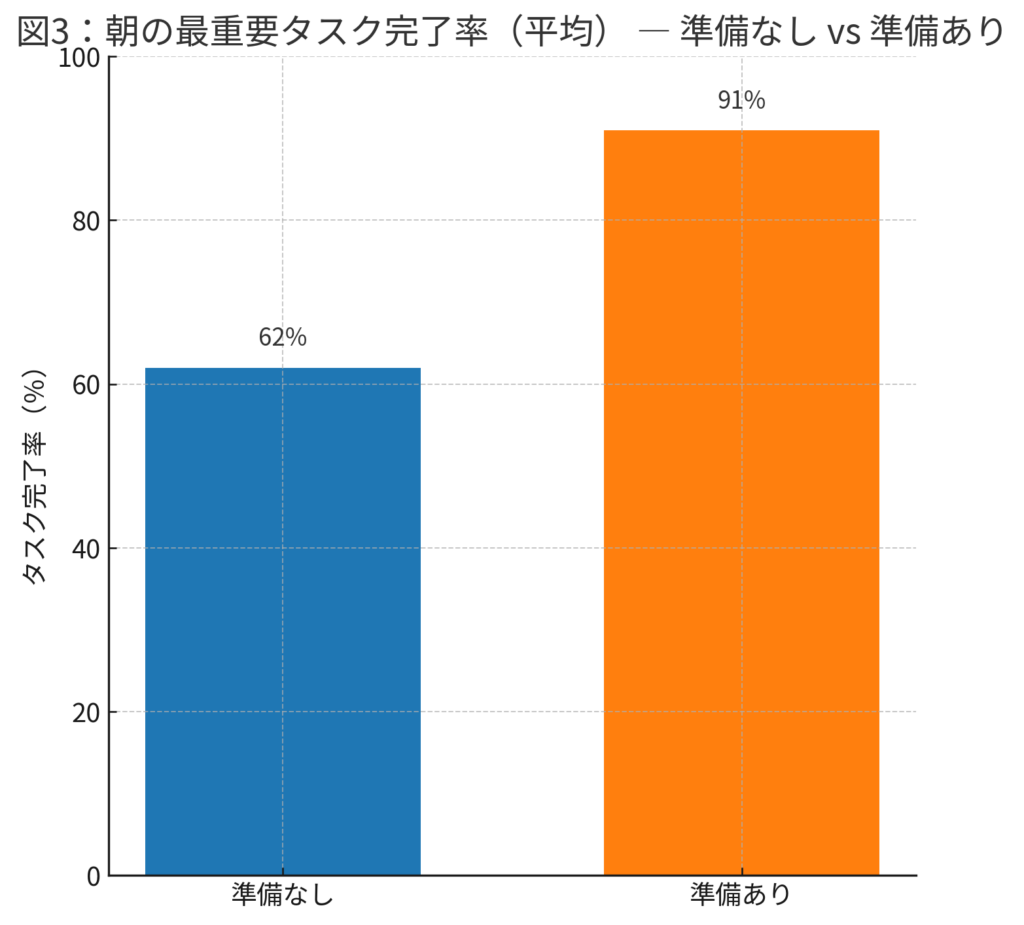 図3:朝の最重要タスク完了率(平均) ― 準備なし vs 準備あり(棒)